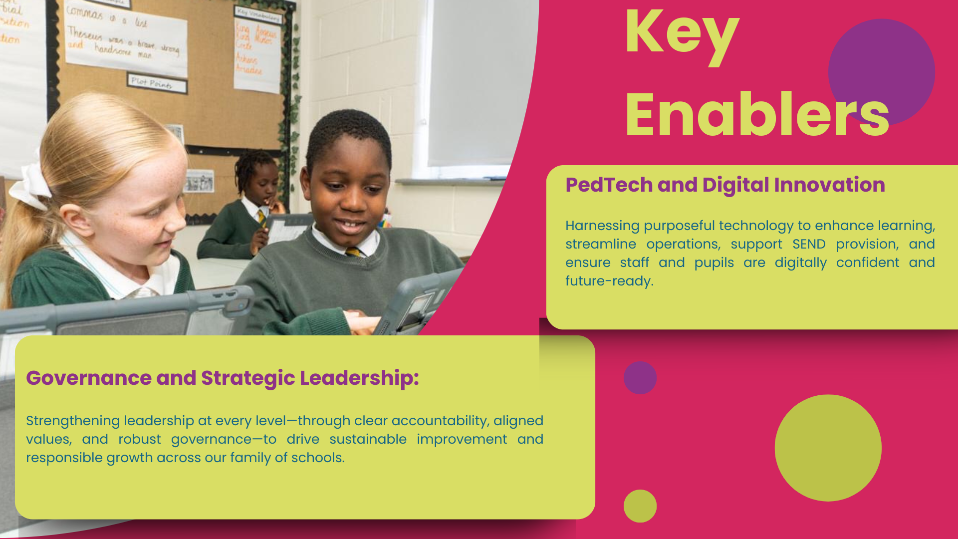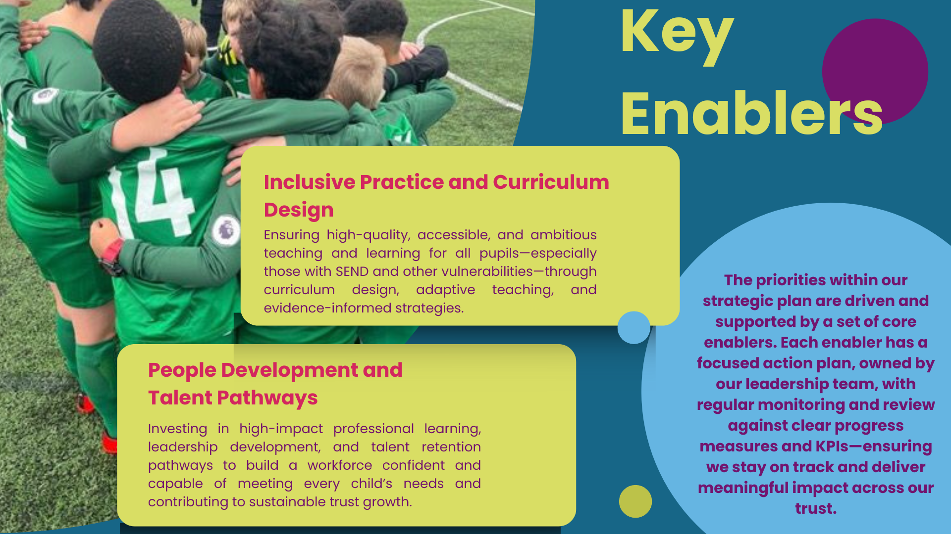 The priorities within our strategic plan are driven and supported by a set of core enablers. Each enabler has a focused action plan, owned by our leadership team, with regular monitoring and review against clear progress measures and KPIs—ensuring we stay on track and deliver meaningful impact across our trust.