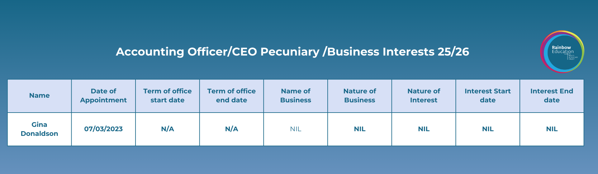 Please see below the register of Business & Pecuniary interests for our Accounting Officer.