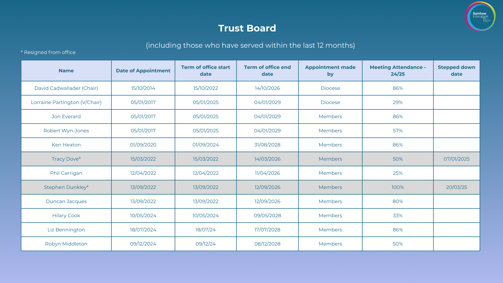 Robert has been a Trustee at the Rainbow Multi Academy Trust since 1st May 2017.